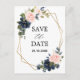 Dark navy blue floral geometric Save the date postcard featuring elegant bouquet of navy blue, royal blue , white , blush rose and sage green eucalyptus leaves and elegant glitter geometric neutral frame. Please contact me for any help in customisation or if you need any other product with this design.