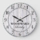 A rustic modern white washed barn wood shiplap monogrammed family name wall clock. Great for your rustic or farm style home or cabin.