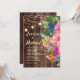 Beautiful pink, blue, orange, and yellow watercolor floral and greenery botanical wedding invitation on a rustic dark brown wood background with string lights and a cute cursive script font. The back of this card is a matching wood background. Contact us for help with customisation or to request matching products.