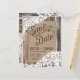 Aged wood planks and white lace over linen-look background rustic country save the date postcard.