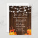 Rustic brown wood with string lights wedding save the date with hand painted pumpkins, maple leaf on a vintage brown wood and elegant calligraphy typography. Perfect for fall autumn weddings. Perfect for country , barn wedding themes.