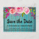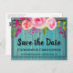 This pretty rustic Save the Date postcard features a blue wood background with trendy typography decorated with a rose watercolor floral bouquet with green leafing. Customise the font and colour of the text to your liking.