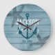 Rustic and elegant blue wood design. Starfish stamp overlay with anchor solid graphic. Custom family name in bold sans serif font and chic script family typography. All text is adjustable. Beautiful design for beach house, vacation home, boat, or nautical themed home decor.