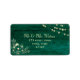 Elegant rustic barn wood green return address label for wedding invitations with gold floral lace and string lights.