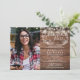 A rustic graduation party invitation featuring pretty string lights and a delicate hand-drawn rustic floral garland of botanical leaf foliage with stylish script typography, on a rustic wood background. Personalise with your special grad photo and party details. Designed by Thisisnotme©
