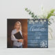 A rustic graduation party invitation featuring pretty string lights, mason jars, a signature style name and modern typography on a blue rustic wood background, personalised with your grad photo and celebration details. Designed by Thisisnotme©