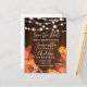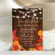 Rustic brown wood with string lights wedding save the date with hand painted orange and red leaf, flowers, wheat branches bouquet and orange pumpkins on a vintage brown wood and elegant calligraphy typography. Perfect for fall autumn weddings. Perfect for country , barn wedding themes.