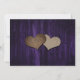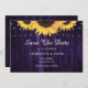 Rustic purple and yellow floral wedding save the date card featuring sunflower flowers and string lights on a rustic wood background.