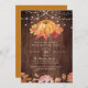 This invitation is perfect for any thanksgiving party! This design features a wooden background texture with string lights at the top, with an arrangement of red and orange leaves and a pumpkin underneath. Under the pumpkin bouquet is your invitation typography, in a blend of rustic script and vintage lettering. At the bottom of the page are some more fall-themed leaves and flowers. To customise this invite, just click the blue "personalise" button at the top and type your details into the text boxes that appear.