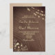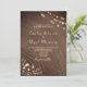 Elegant, vintage, rustic wood wedding invitation with gold floral lace, string lights and modern calligraphy script.