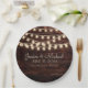 Rustic wood and string lights personalised wedding reception paper plate.  Add the couple's names and wedding date.