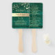 Elegant, modern, rustic barn wood green wedding program hand fans with gold floral lace, string lights and trendy calligraphy script.