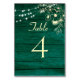 Elegant, country, rustic wood emerald green wedding table number with vintage gold floral lace and string lights.