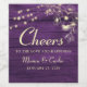 Elegant, modern, rustic barn wood purple wedding wine label with gold floral lace, string lights and trendy calligraphy script. Cheers to the Love and Happiness.