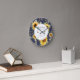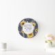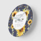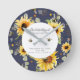 "Rustic Wood Sunflower Bee Yellow Baby Birth Stats Round Clock." A fun way to celebrate your new little one with your baby's birth stats: full name, date, time of birth, weight and length are easily customised using the template fields. Rustic navy blue wood with sunflowers, eucalyptus leaf greenery, dried foliage and bumble bees were originally hand painted by internationally licensed artist and designer, Audrey Jeanne Roberts. Copyright.