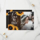 Rustic sunflower save the date photo cards featuring sunflowers against a barn wood background adorned with string lights.