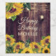 Rustic wood, yellow sunflowers with greenery, and sparkling string lights and lanterns "Happy Birthday" custom bottle label. Contact us for help with customisation or to request matching products.