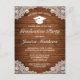 Graduation invitation postcard. Rustic style with brown wood planks background and white lace decor.