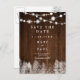 Send your save the date card with this rustic brown wood Fall and winter pine trees forest wedding string lights with white pine trees showing a wonderland of wood land , with elegant and modern typography.