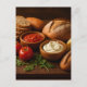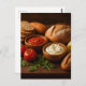 Rustic wooden board with artisan breads cheese postcard