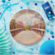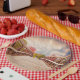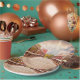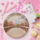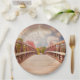 Paper plates with a scenic photograph. A wooden bridge leading towards a pathway surrounded by forest trees changing colour.