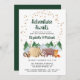 Sweet rustic couple's baby shower invitation featuring a cute illustration of woodland animals with their tent camping in the mountains and forest, an overlay of gold stars and "Adventure Awaits" and the names of the mother and father in a dark hunter green script. Easily personalise the shower details.