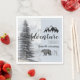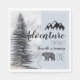 Adventure awaits, rustic woodlands bear pink girl 1st birthday party napkins in a soft pastel pink hue, with a majestic forest pine tree and mountain silhouette. Personalise for your celebration.