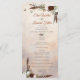 Bordered by an assortment of white, hickory and burgundy flowers, woodland leaves and a set of rustic feathers, this wedding program is set on a beige, chestnut, taupe and umber hand painted canvas. Customise the content with your names, wedding venue and date, as well as your wedding ceremony. The reverse side features your wedding party prominently placed in the centre of the canvas. The design features moveable graphic elements so you can customise the layout to your heart's content. This wedding program coordinates well with the rest of the items in the Rustic Woodland Feathers and Floral Bloom Collection.