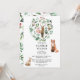 A rustic woodland forest animals watercolor baby shower invitation in a gender neutral style witch cute animals. Fox, bird, deer, rabbit, and greenery in a circle.