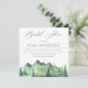 Rustic watercolor woodland forest trees and mountain scene, bridal shower invitation. Modern chic typography design style template with coordinating forest green colour backing.