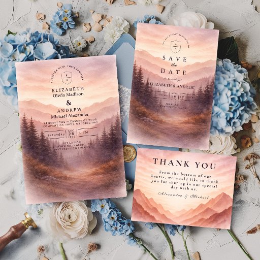 A serene and atmospheric design inspired by misty mountain landscapes and quiet forest scenery. Soft watercolor layers of pine trees and distant hills fade gently into the background, creating depth and a calm, romantic mood. The muted palette of sage green, cool grey, and soft ivory gives the design a refined, nature-driven elegance—perfect for couples drawn to minimalist aesthetics and intimate outdoor celebrations.