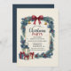 This charming Christmas party invitation features a hand-painted wreath border with evergreen branches, holly leaves, red berries, golden bells, and blue ornaments. A burgundy ribbon bow tops the design, while a vintage lantern and wrapped gifts add festive warmth. Perfect for holiday gatherings with a rustic, traditional aesthetic. Fully customizable for your event details.