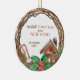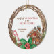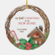 Rustic Wreath First Christmas In Our New Home Ceramic Ornament with wood twine branch wreath and gingerbread house, candy cane and holly.
