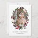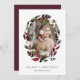 Elegant botanical holiday cards feature your favourite photo encircled by a rustic oval wreath of soft green and maroon foliage and blush flowers. Personalise with your custom greeting and names beneath; shown with "Season's Greetings."