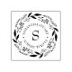 This stamp features a rustic botanical wreath and monogram initial, and framed by two custom text areas.