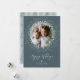 Holiday photo card featuring a rustic wreath of leaves and twigs on a pewter-colored background. Brush script calligraphy adds a classy touch.