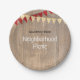 This neighbourhood picnic paper plate features a rustic design with a wood background. This plate is accented with red and yellow plaid flag banners. Personalise these plates with your street or neighbourhood name.