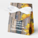 Chic elegant pretty old wood textured wooden barn door and a stylish natural bright yellow sunflower floral flower design. This elegant rustic country style spring or summer wedding favour box, can easily be personalised with the bride and grooms names to the templates to create your own unique classy stylish natural feminine girly custom favour box for your special western themed marriage occasions and celebrations. Visit the PERSONALIZED_ WEDDINGS STORE for matching coordinated wedding sets.