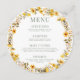 Indulge in vibrant elegance with our rustic spring/summer wedding menu card. Featuring a wreath of yellow flowers and delicate dusty green text, it adds the perfect touch to enhance your dining experience. Explore our selection for a seasonally inspired addition to your celebration.