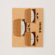 A jigsaw puzzle with a design that shows three, smiling s’mores and the word “S’mores” below them. The word can be customised as you like.