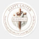 A serene circular design centred around a wooden cross draped with a soft white cloth, crowned with a symbolic wreath. The word “Blessings” rests at the heart of the composition, surrounded by a clean, balanced ring of text. Warm earthy tones and gentle contrasts create a peaceful, reverent atmosphere perfect for celebrating the spirit of Easter.