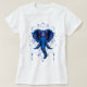 This visually striking image depicts the head of an elephant, adorned with intricate geometric patterns and symbols. The elephant's eyes glow with a vibrant blue light, and its trunk is raised in a gesture of reverence. The overall colour palette is a combination of blue, red, and black, creating a striking contrast. The image is framed by a complex geometric design, suggesting a spiritual or mystical connection.