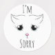 A drawing of a cat crying, that is sandwiched between the text, "I''m Sorry."