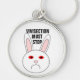 This keychain features the sad face of a white rabbit. This rabbit has a big frown on its face because it is a lab rabbit that has had cosmetics tested on it. The whites of its eyes are red and swollen. The design has been created to bring to attention the unnecessary suffering caused by the testing of cosmetics on animals. The black text between the ears of the bunny says, "vivisection must stop"