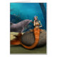 3D digital render of a beautiful sad mermaid sitting on a stone and a cute dolphin on blue fantasy ocean background