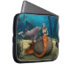 3D digital render of a beautiful sad mermaid sitting on a stone and a cute dolphin on blue fantasy ocean background