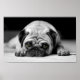 Black and white photograph of a very adorable little pug with soulful brown eyes.