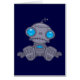 Vector cartoon illustration of a cute, but sad little robot with blue eyes sitting on the floor.