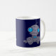 Vector cartoon illustration of a cute, but sad little robot with blue eyes sitting on the floor.