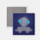 Vector cartoon illustration of a cute, but sad little robot with blue eyes sitting on the floor.
